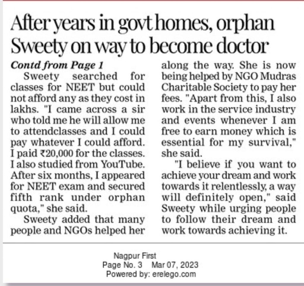 We are proud to announce that one of our beneficiary, has cleared NEET (Indian medical entrance exam) and is on the path to becoming a qualified doctor